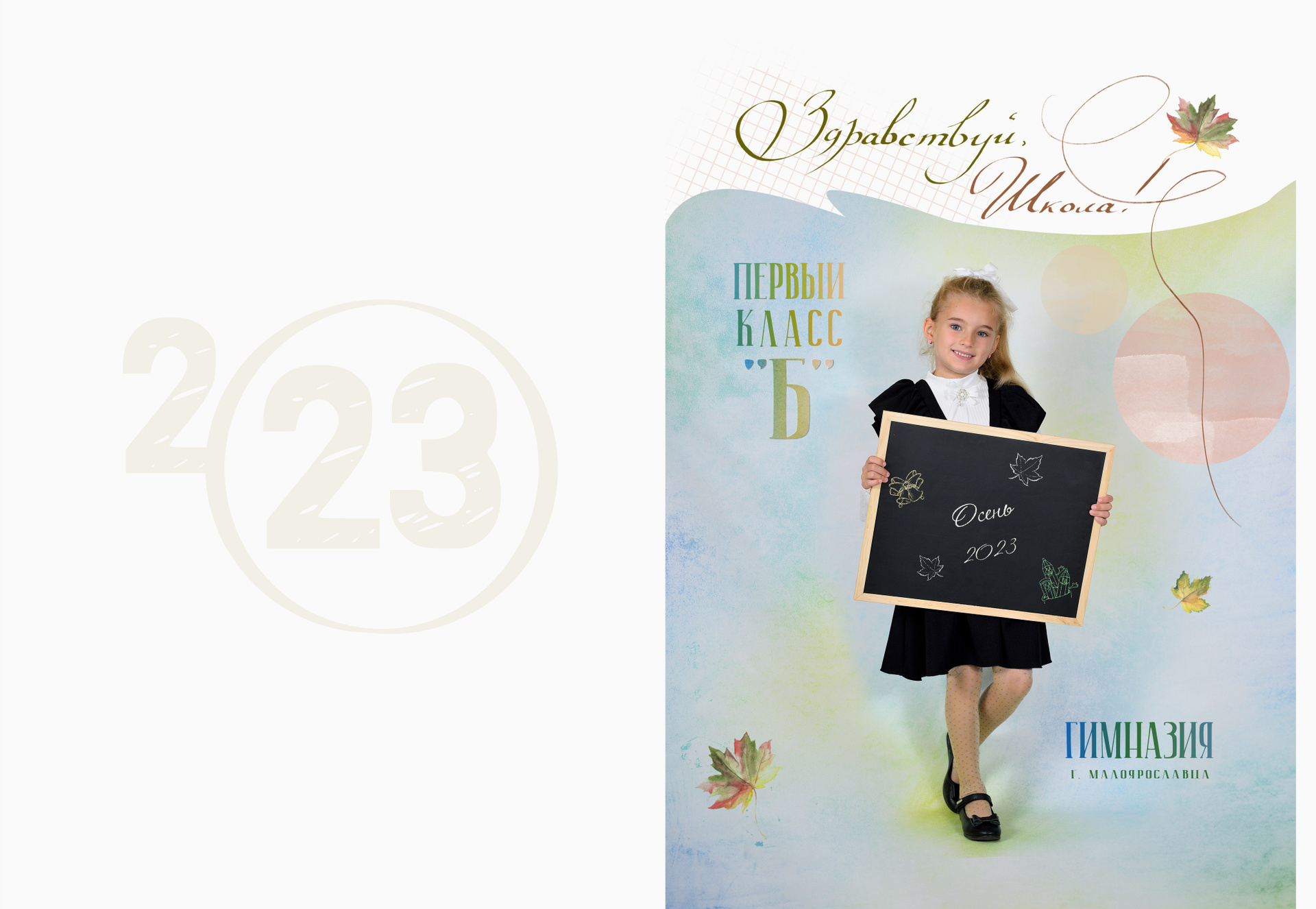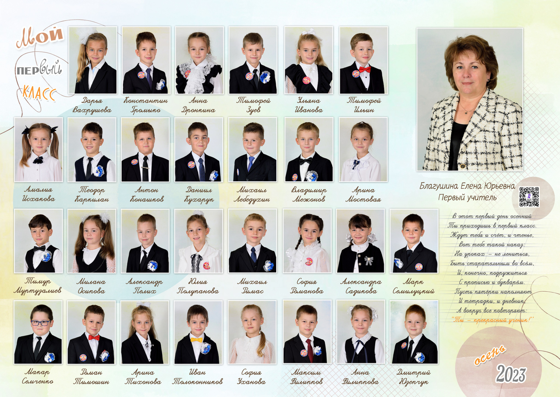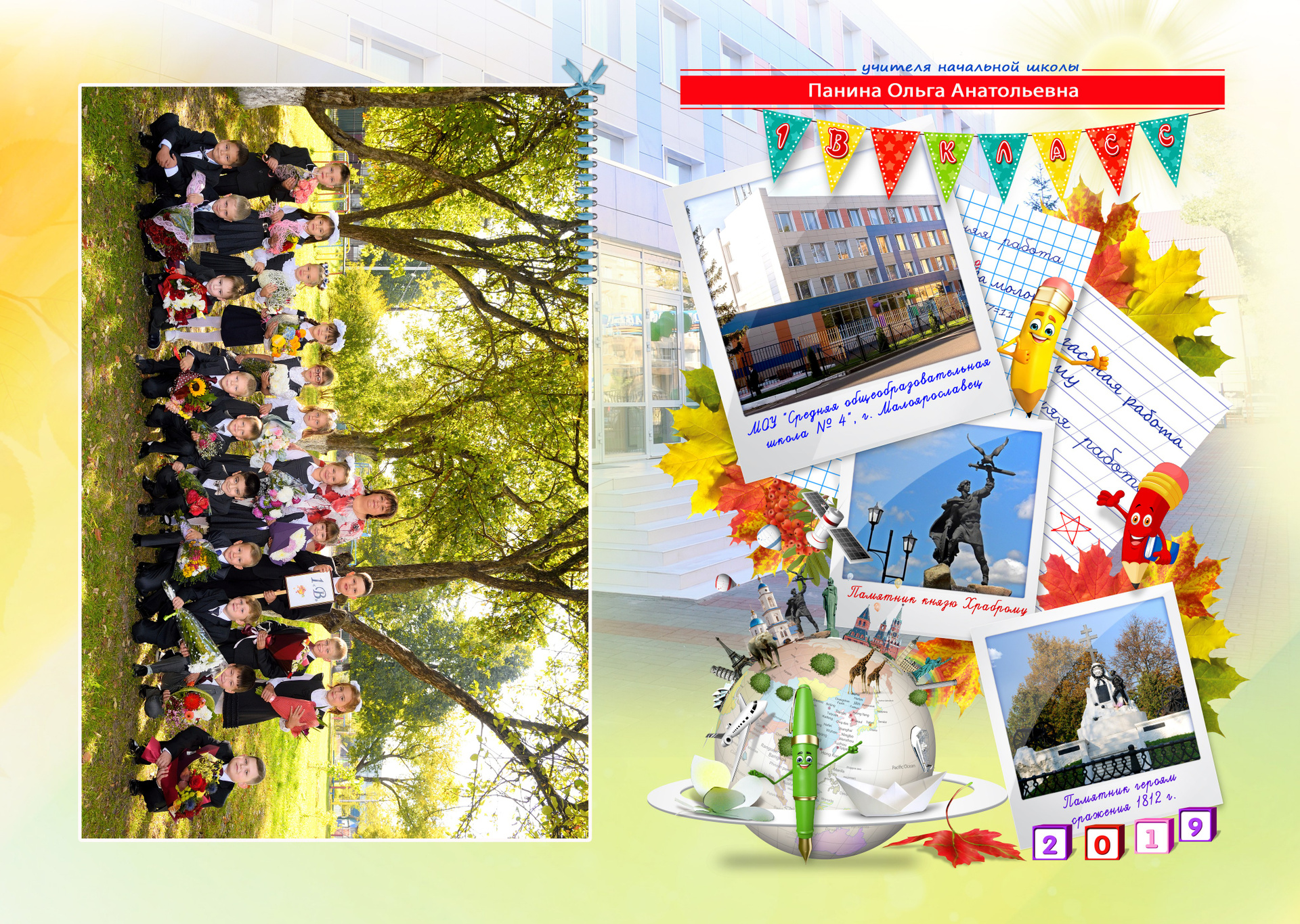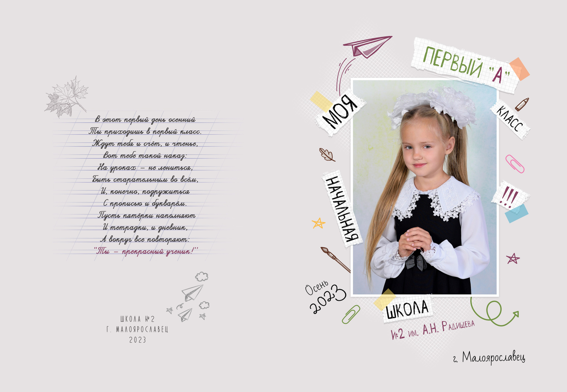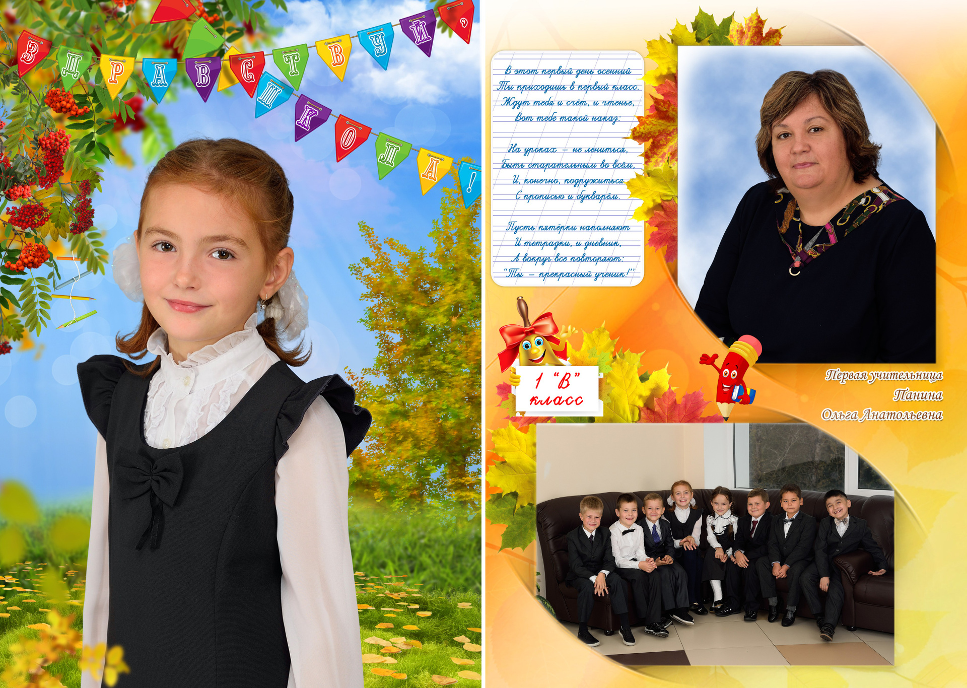 - Первый разворот: Крупный портрет ребенка, учитель и напутственное слово.