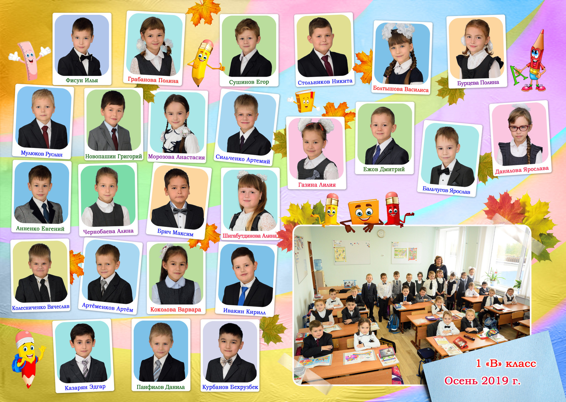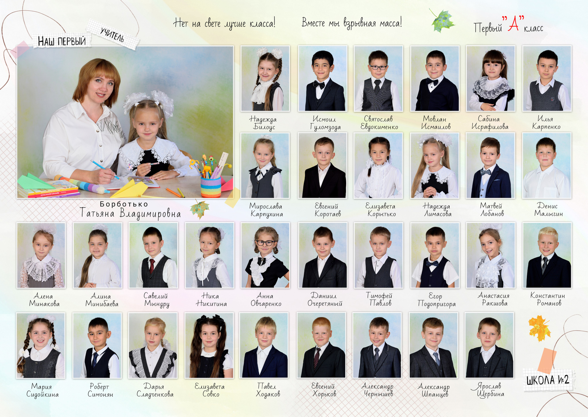 - Второй разворот: Виньетка с портретами детей с подписанными фамилией и именем, 3-4 коллективных фотографии (точное количество определяется количеством детей)