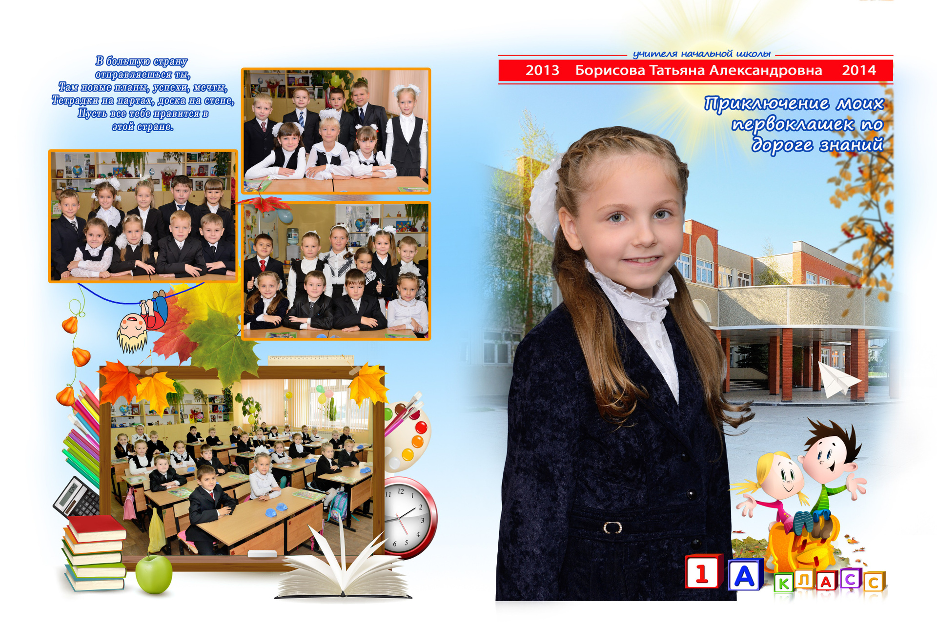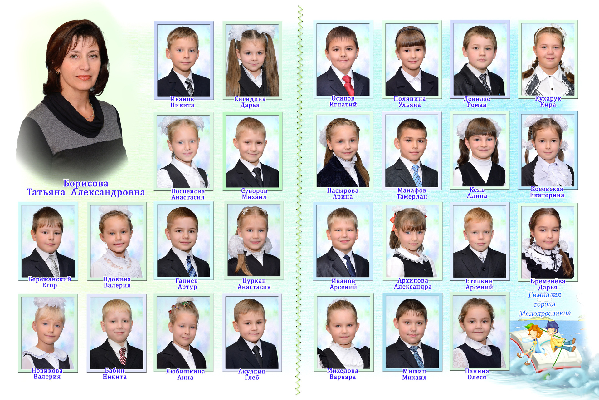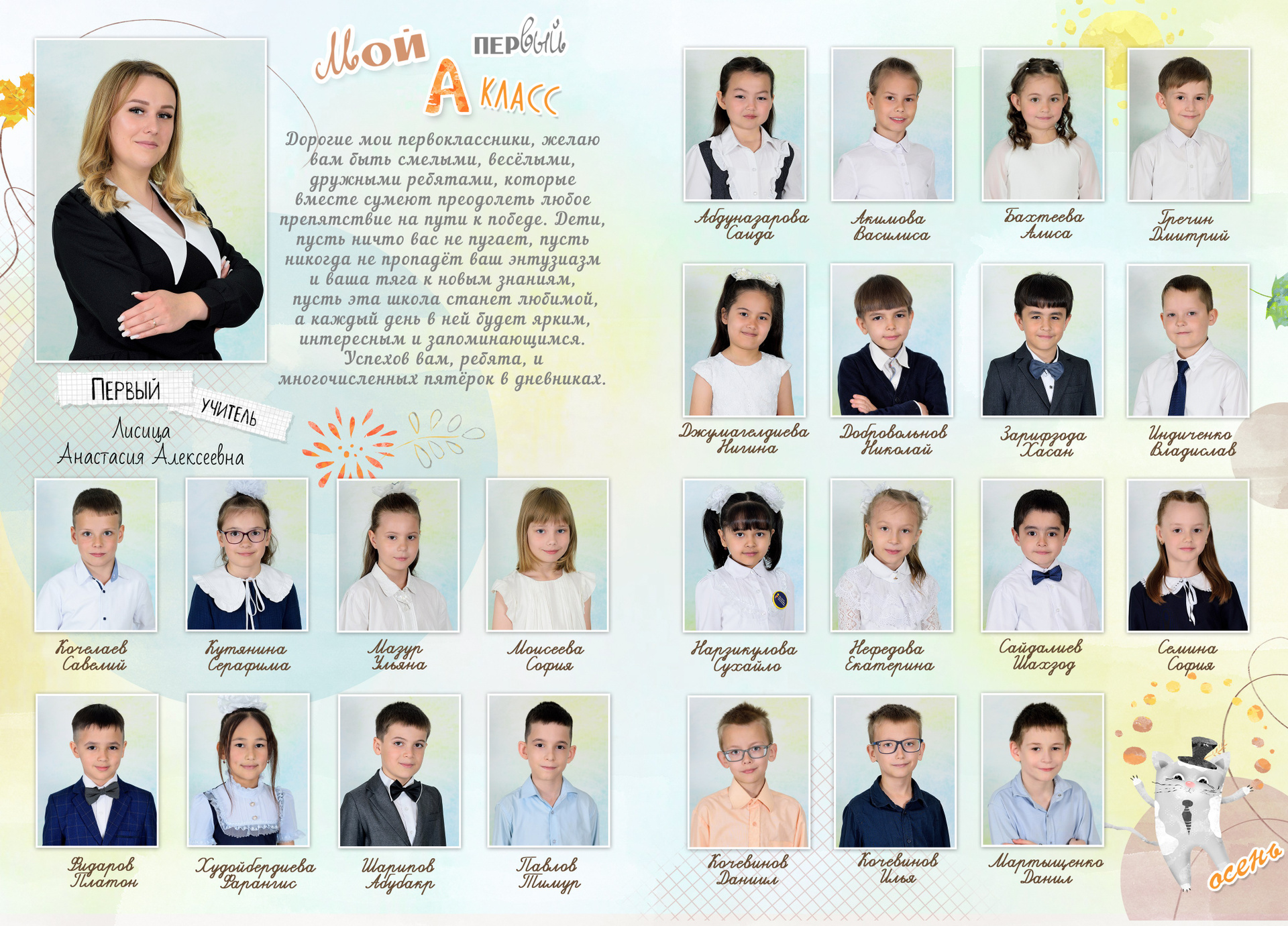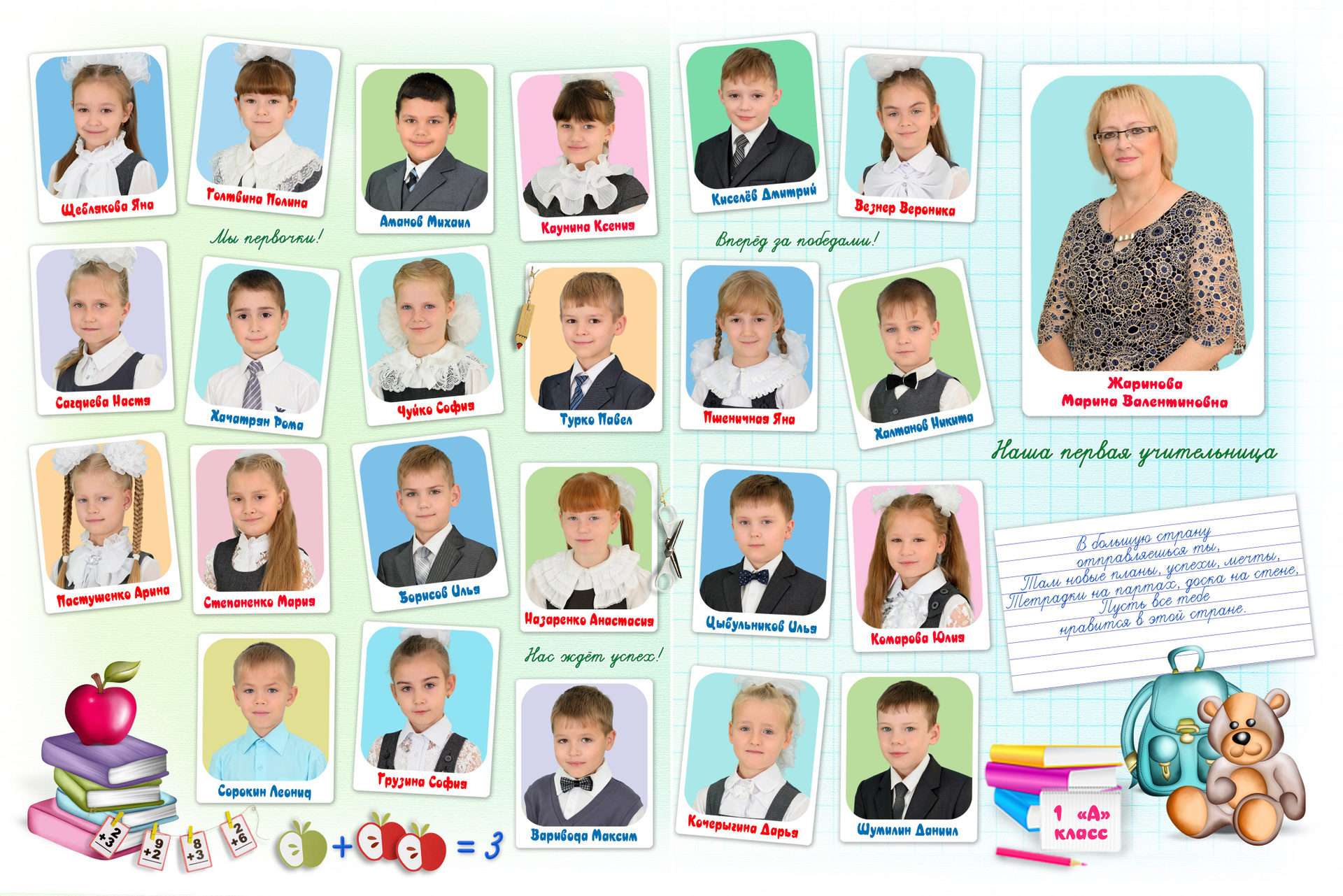 - Первый разворот: Виньетка с портретами детей и учителя с подписанными фамилией и именем