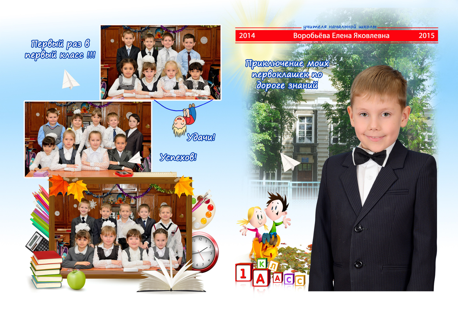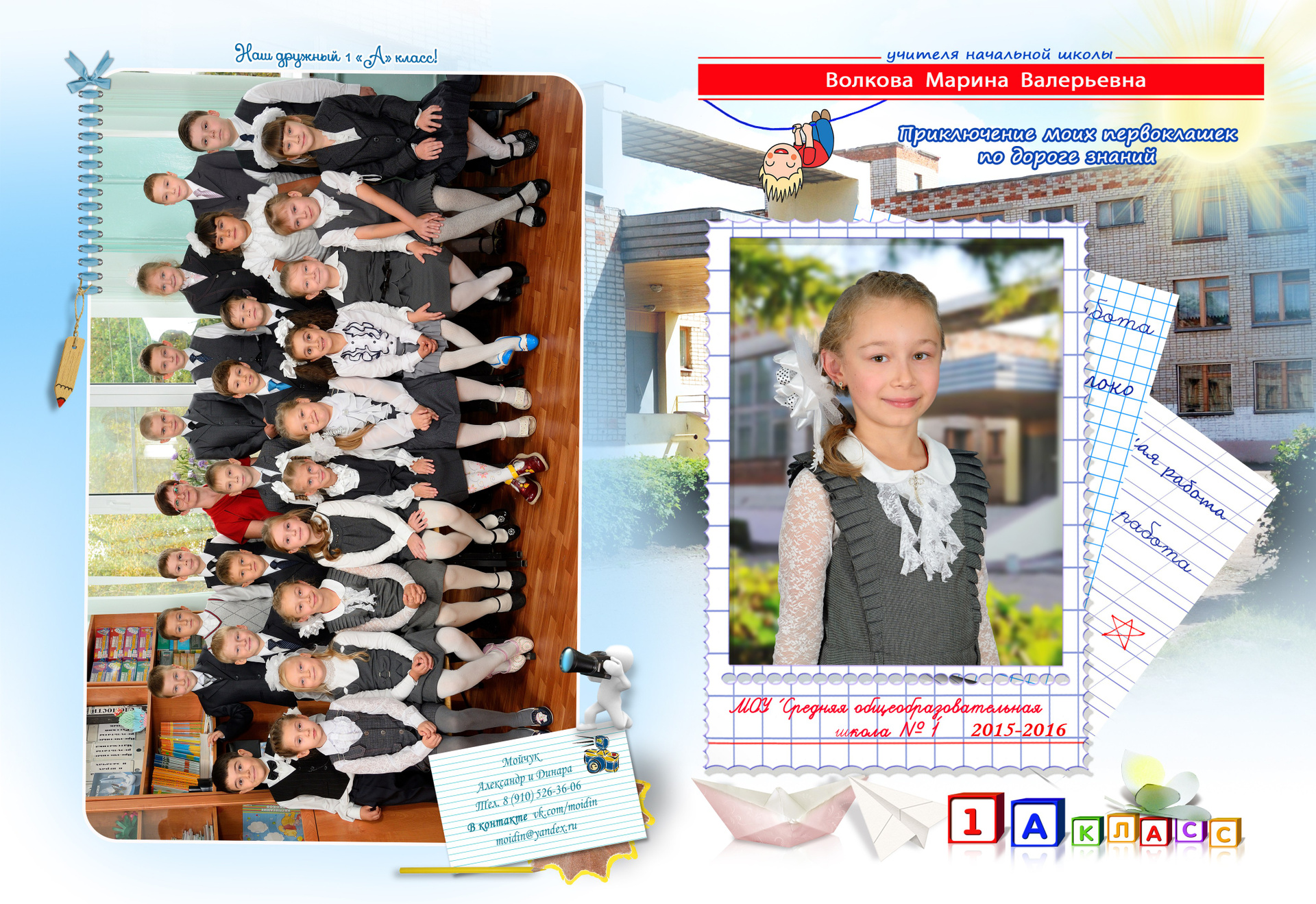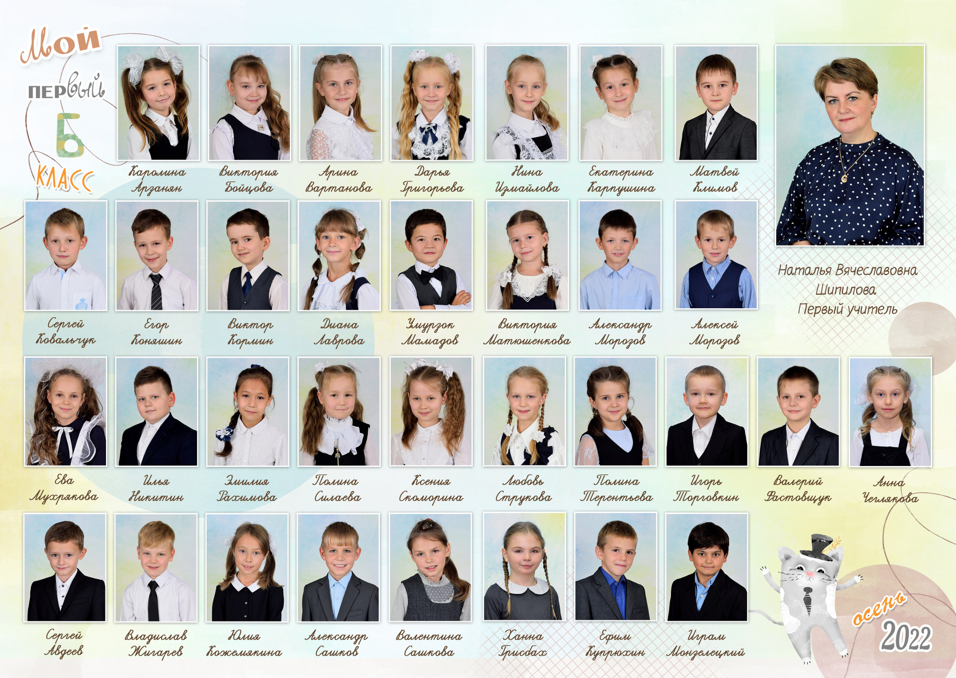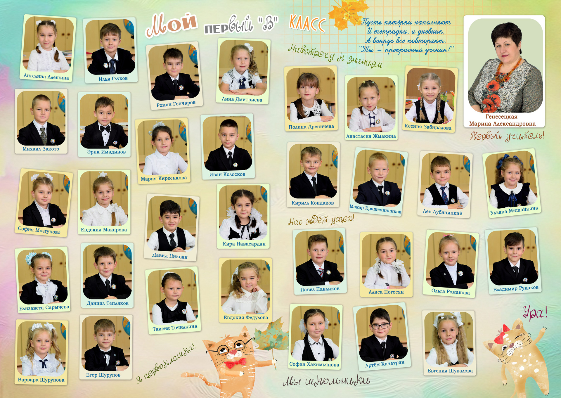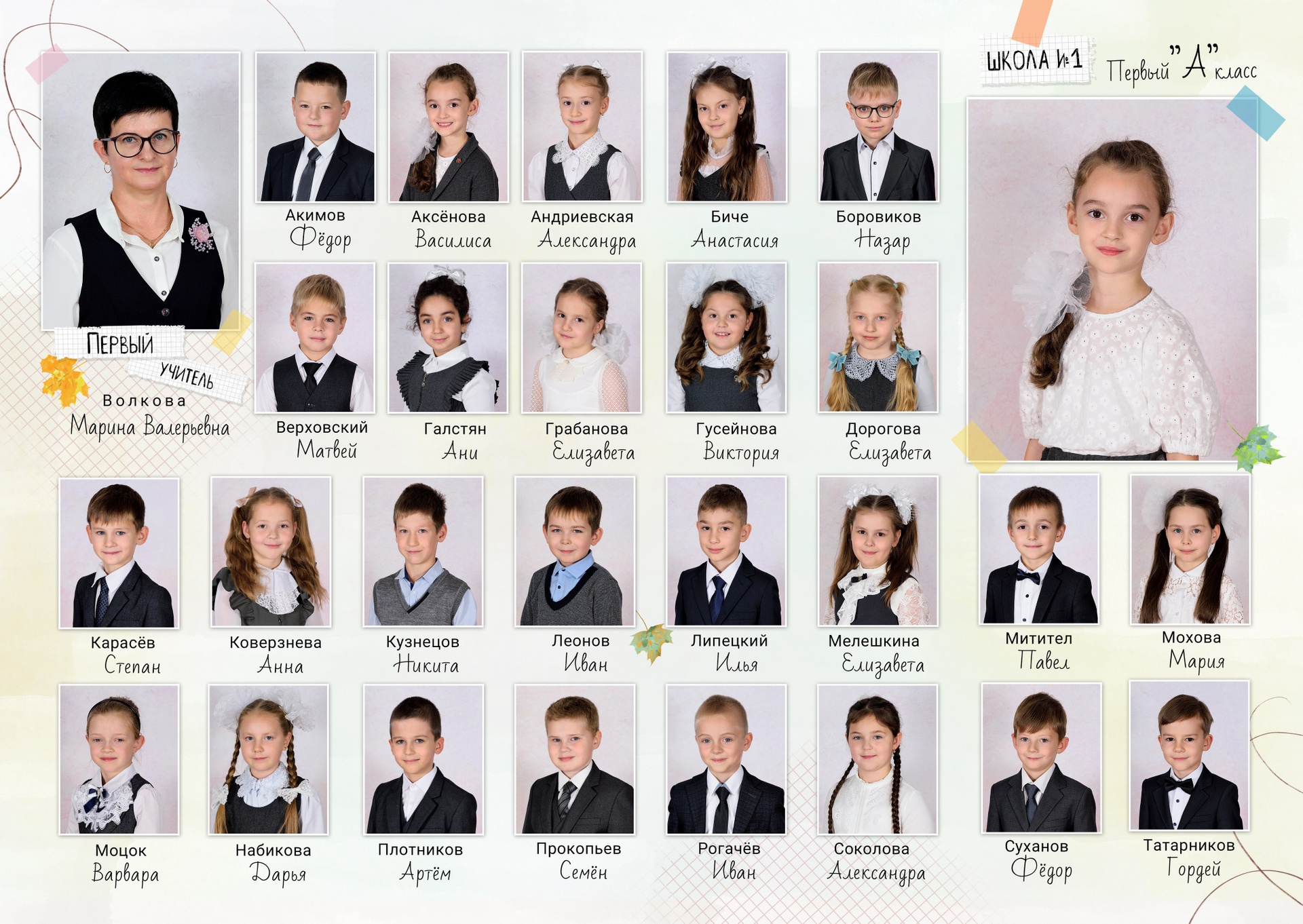 - Первый разворот: Виньетка с портретами детей и учителя с подписанными фамилией и именем