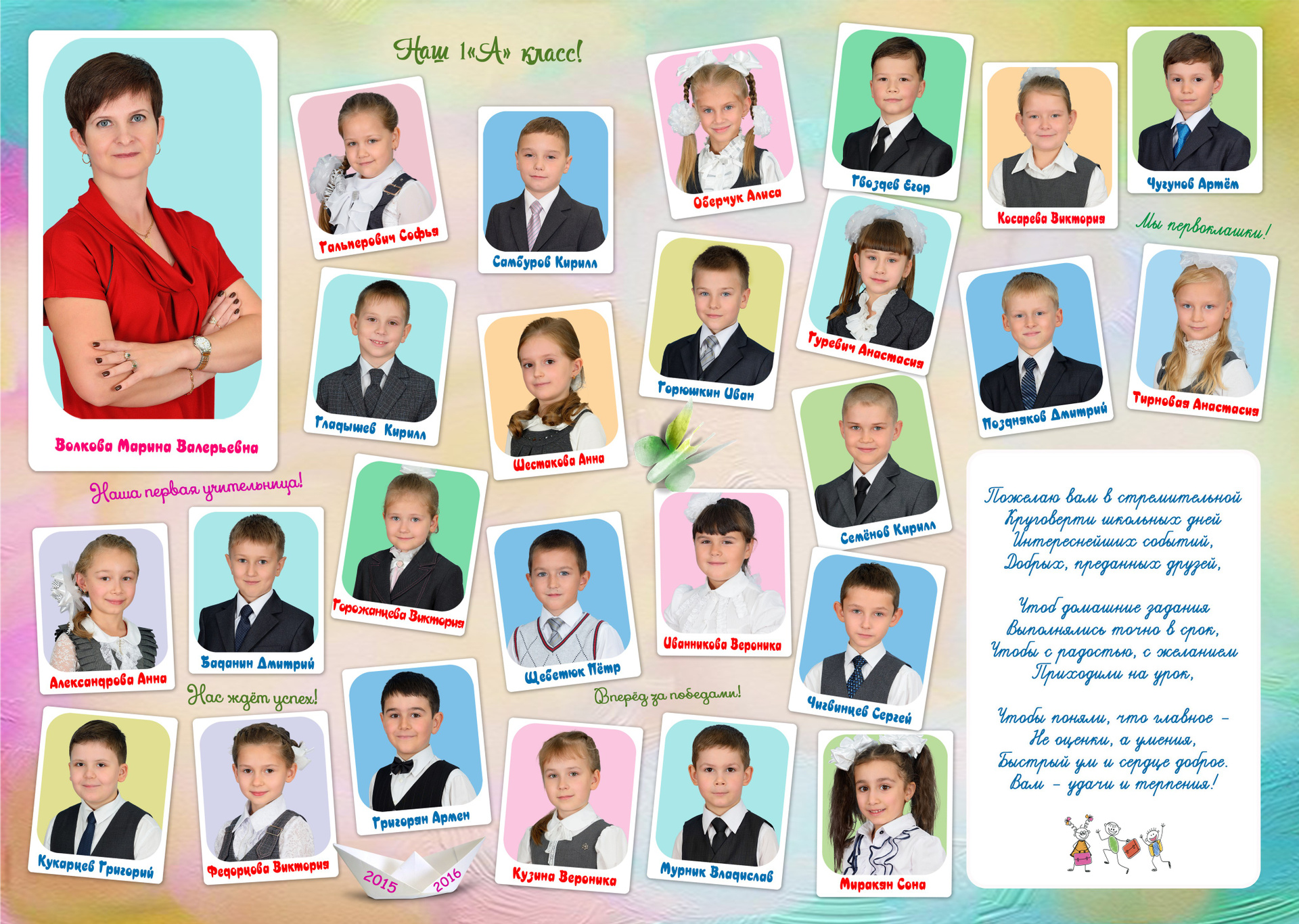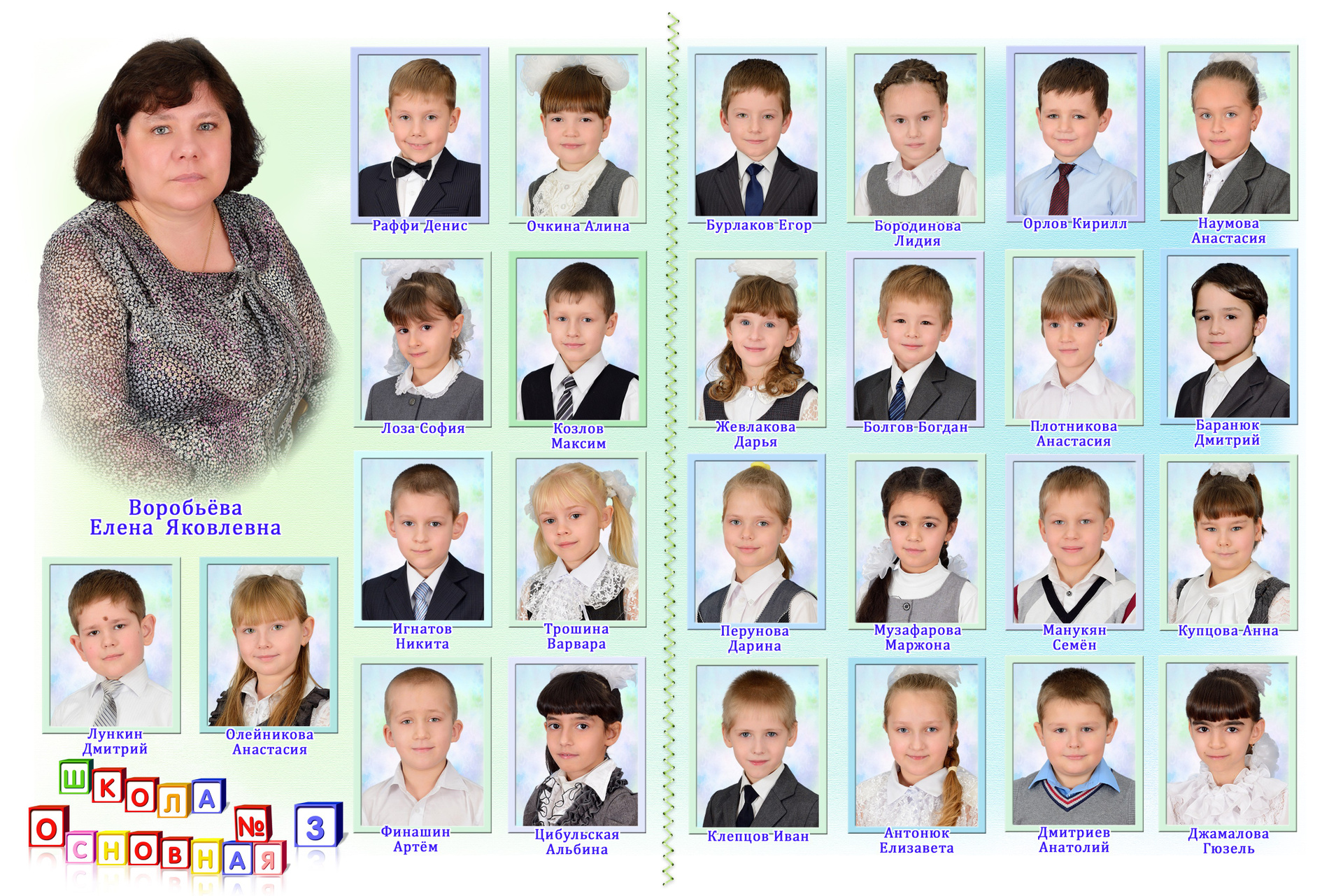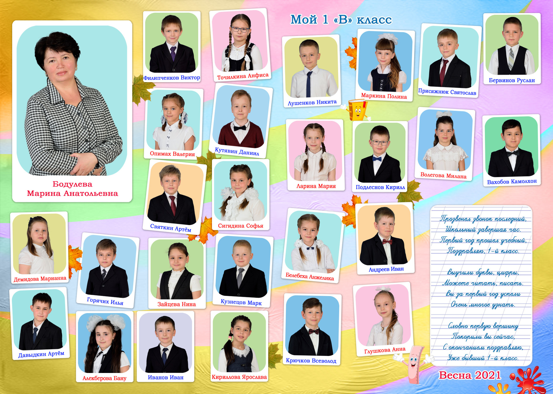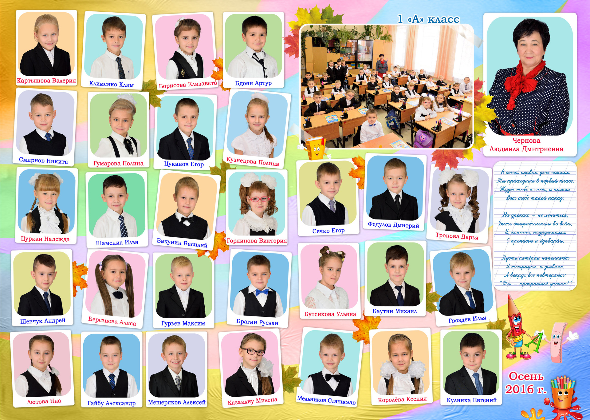 - Первый разворот: Виньетка с портретами детей и учителя с подписанными фамилией и именем