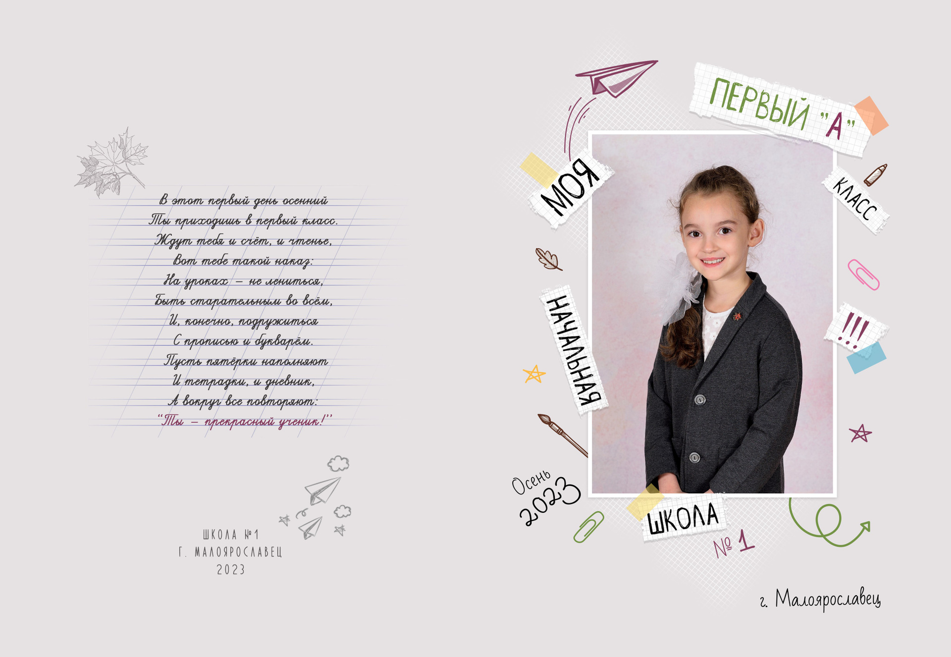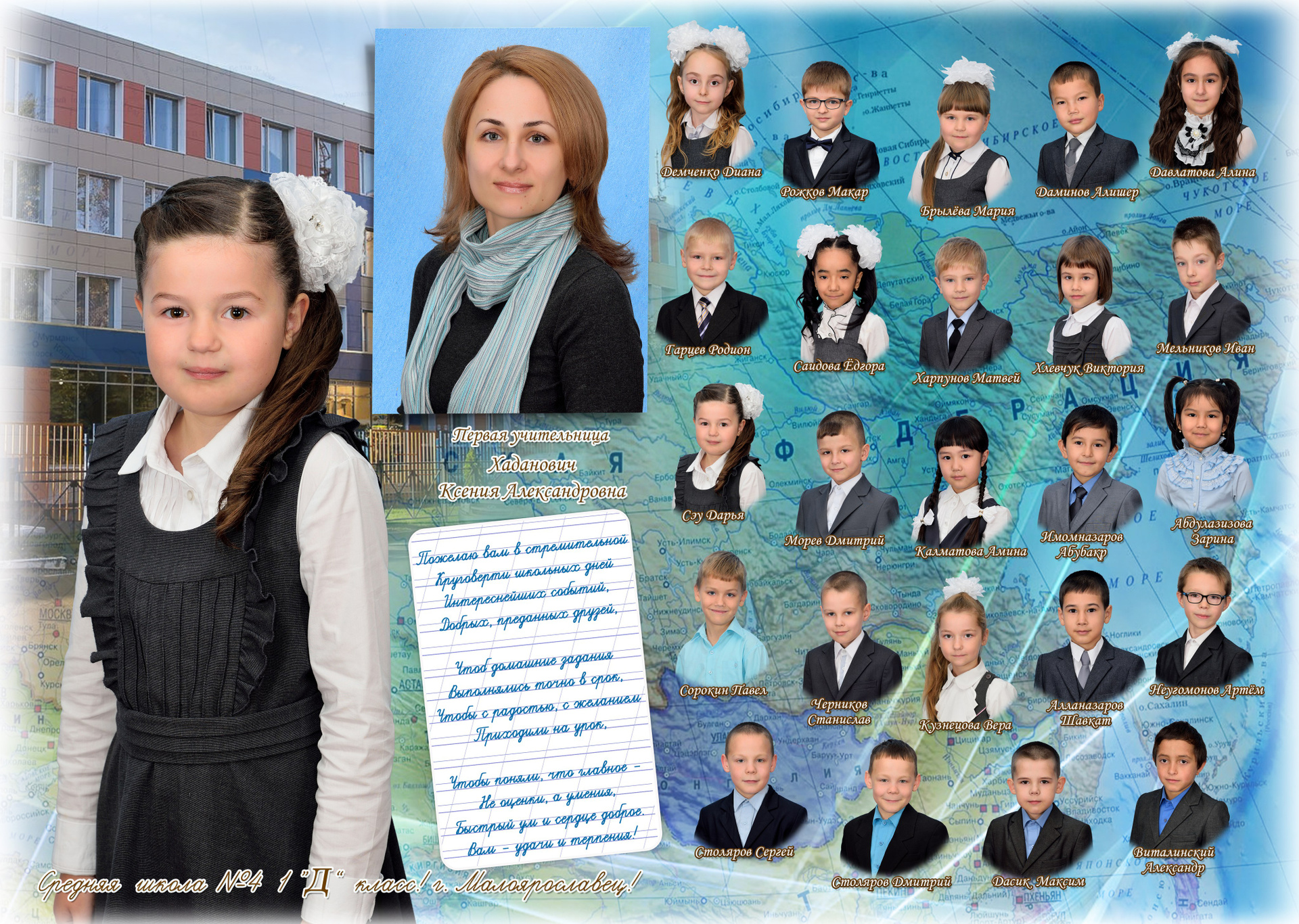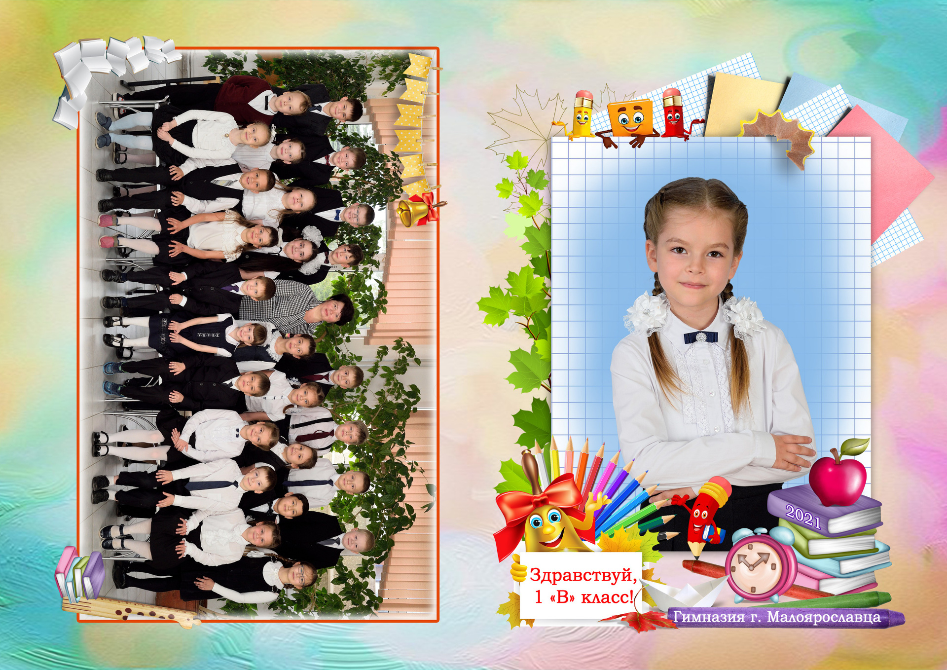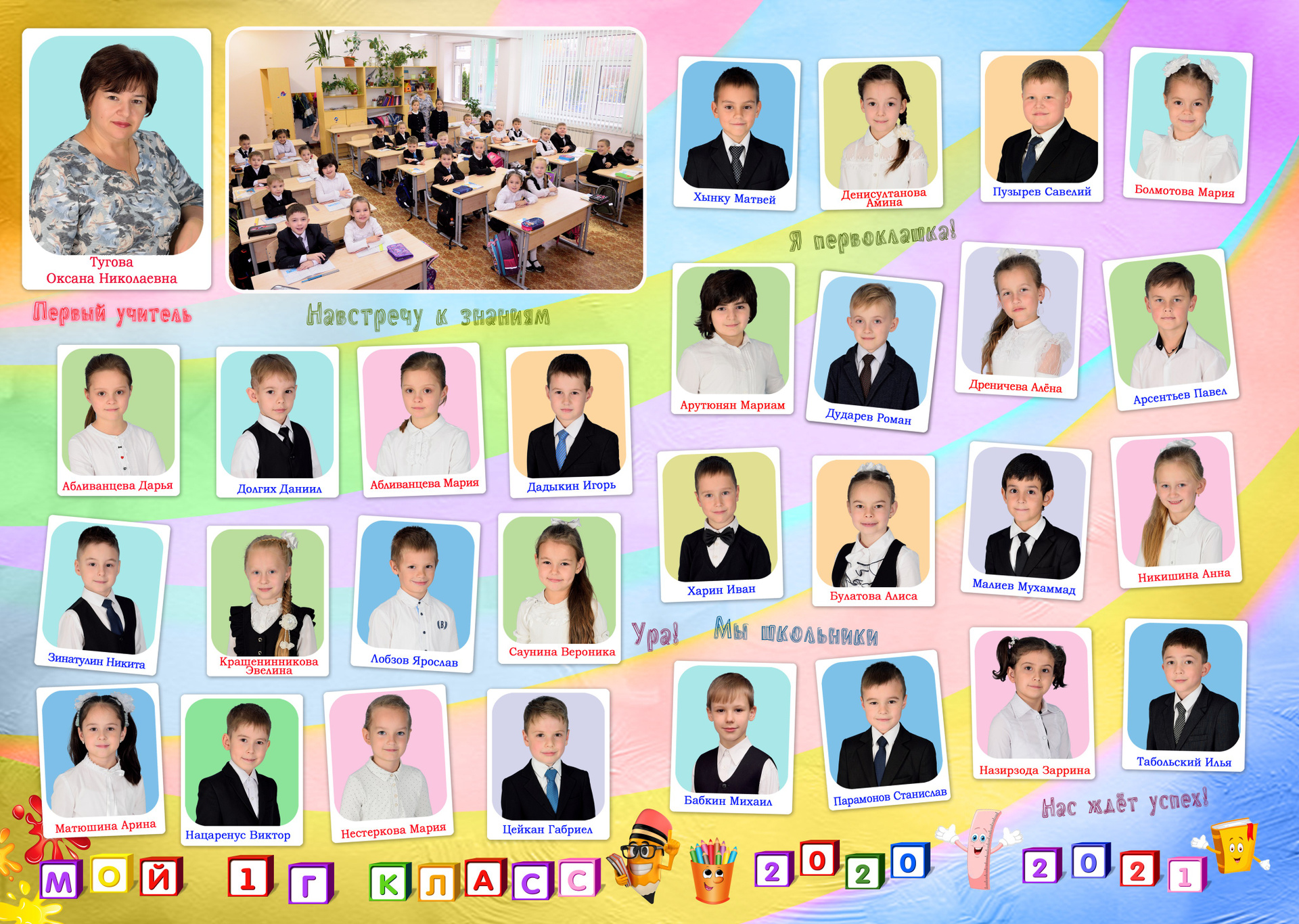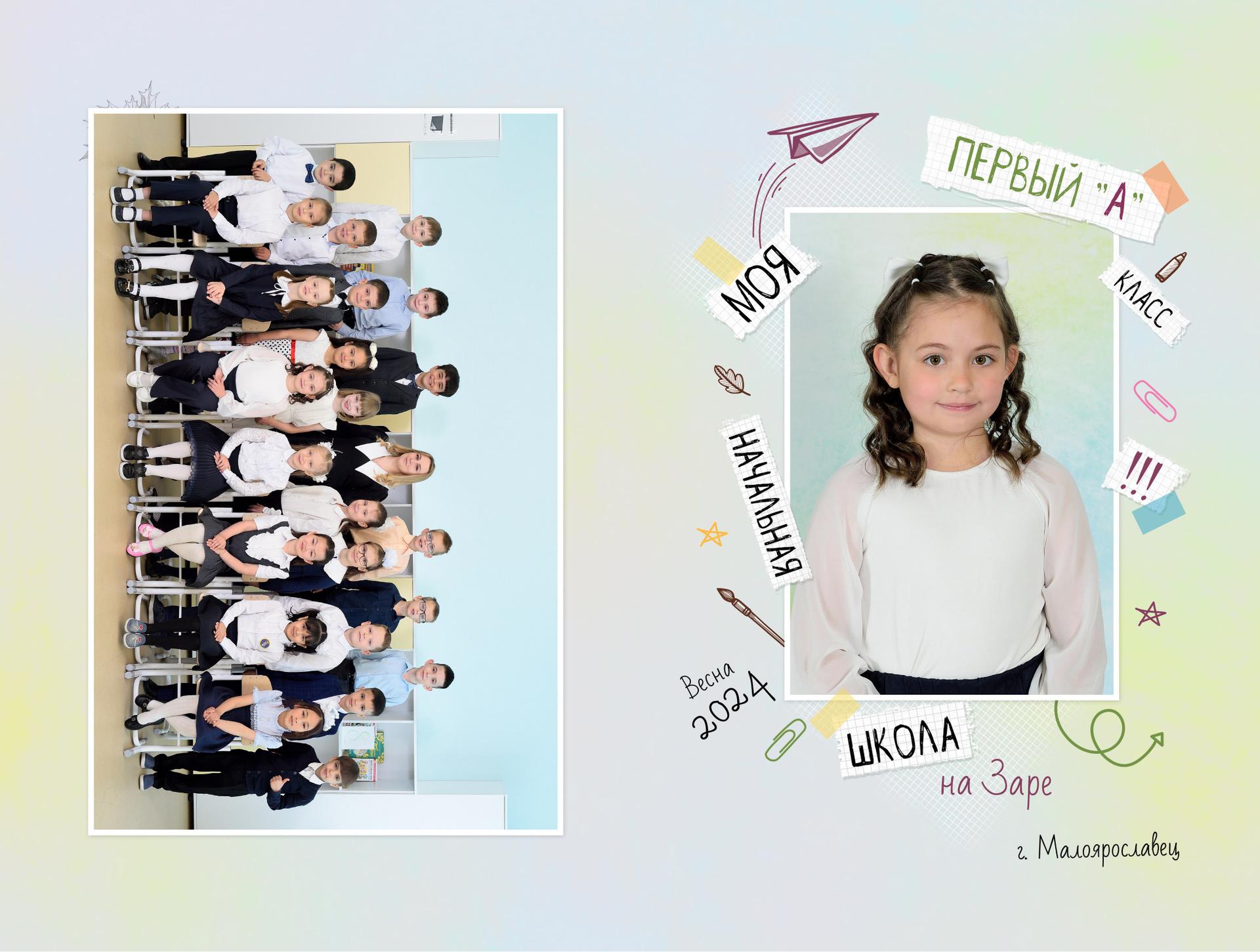 - Первый разворот: Виньетка с портретами детей и учителя с подписанными фамилией и именем
